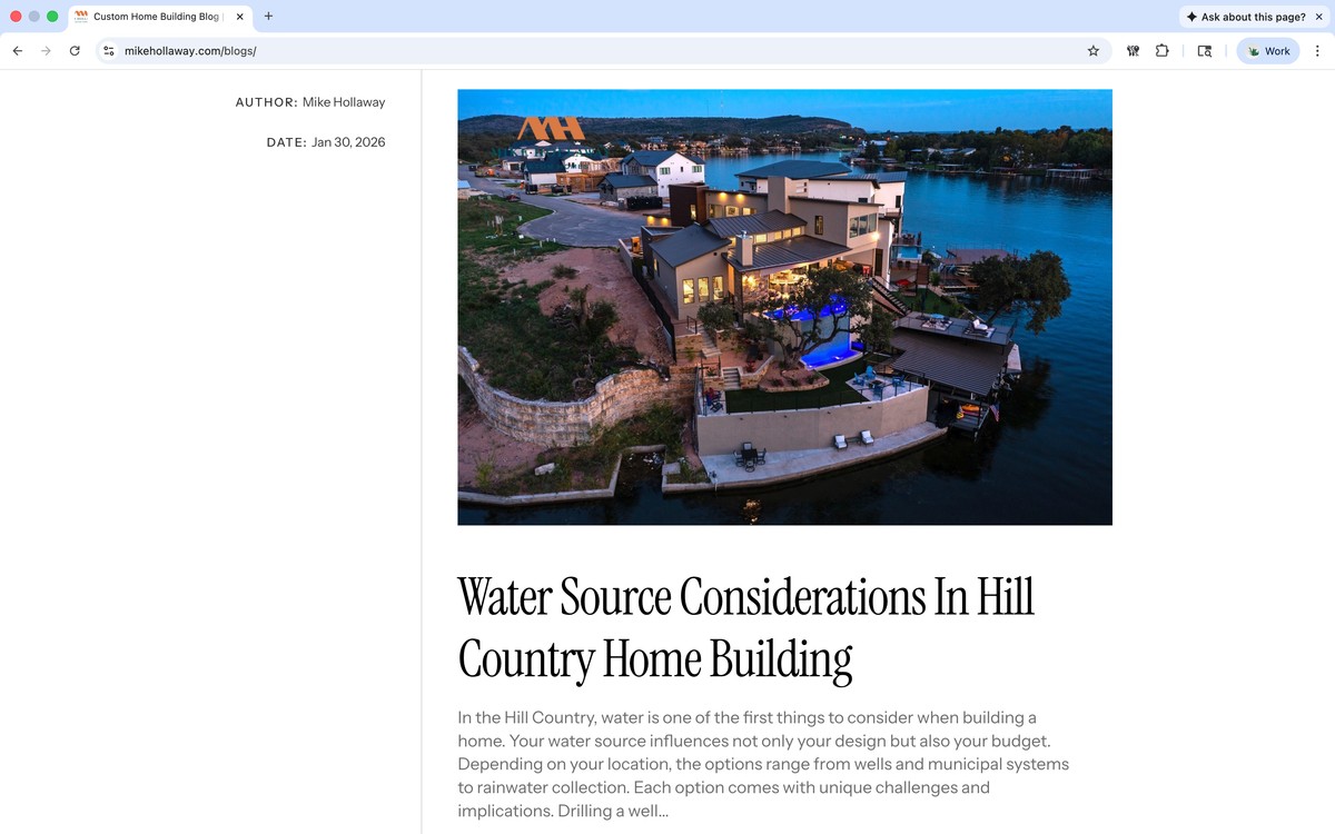 Our Ultra Web Approach As part of our Ultra Web package implementation, we trained agentic AI system on Mike Hollaway Custom Homes’ unique story, philosophy, and differentiators. We captured their authentic voice and expertise, then used that knowledge to create strategic content that truly represents who they are and what makes them different in the luxury home market.